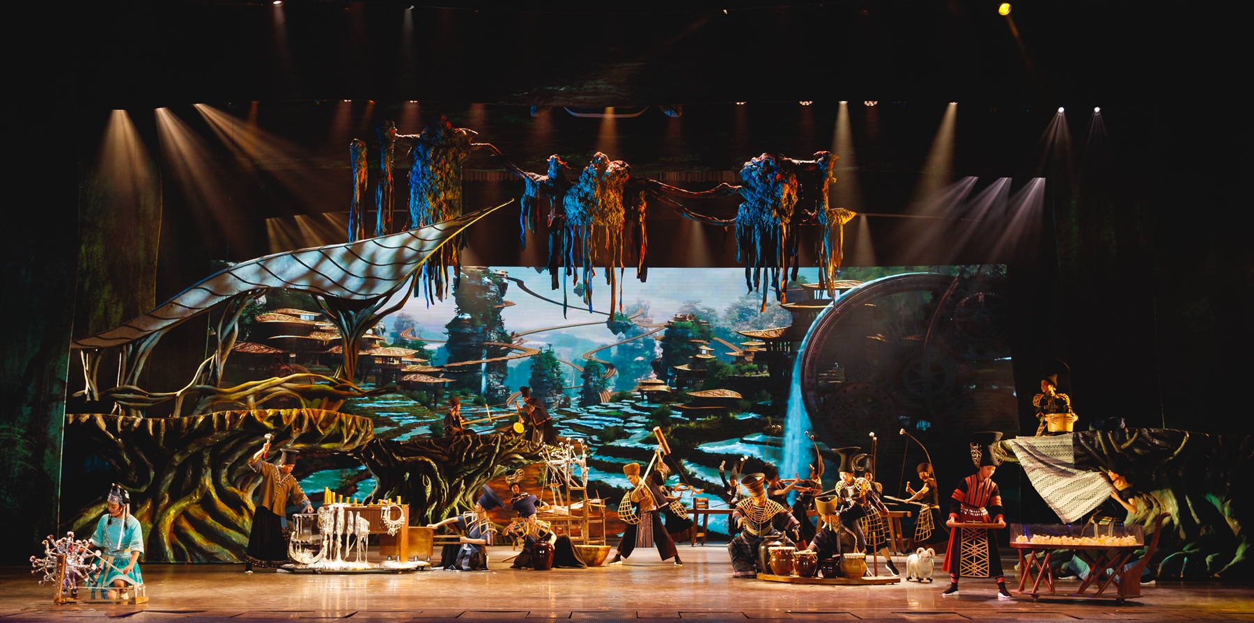 清晨,張家界大山中的古老山寨在雞鳴犬吠聲中蘇醒,山民們?cè)诔筷乩锩β灯鸶髯缘臓I(yíng)生。于是缸、罐、盆、碗變成了樂器,彈棉花、篩米、紡紗、鋸木合奏成了優(yōu)美的旋律,苗族水腔、土家族打溜子等非物質(zhì)文化遺產(chǎn)依次呈現(xiàn)……