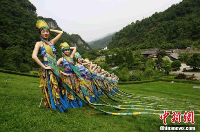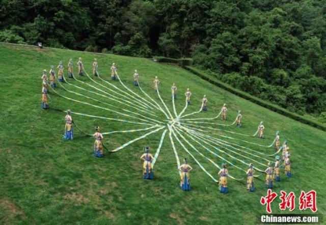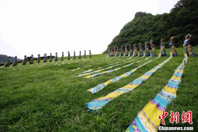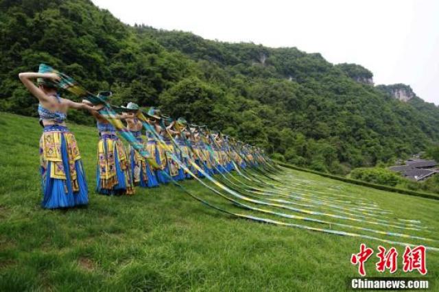 張家界武陵源上演苗族頭帕秀。